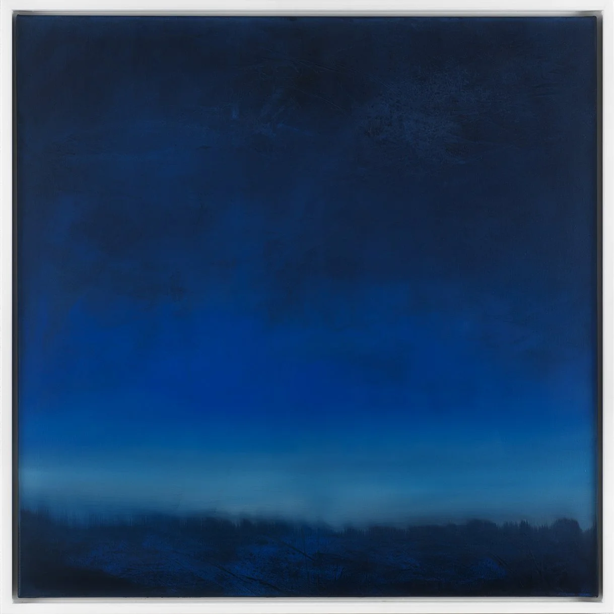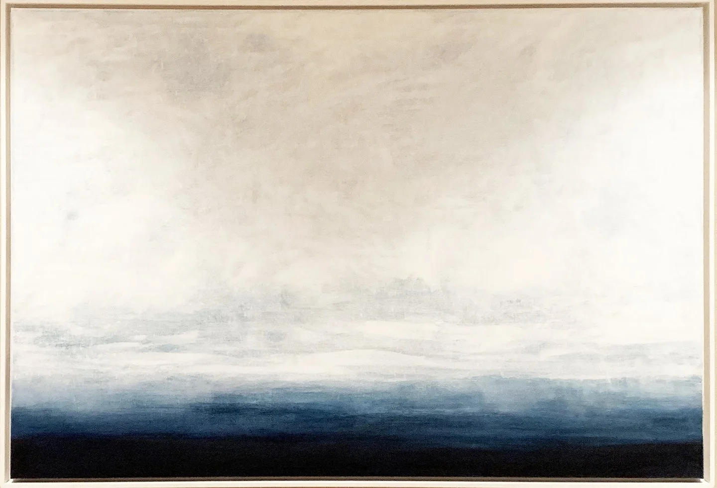 Abstract painting with shades of beige, gray, blue, and black, blending horizontally from dark at the bottom to light at the top.