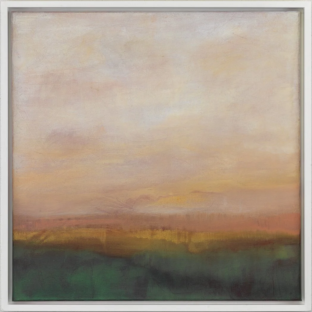 Abstract landscape painting with a sunset sky in soft pink, orange, and yellow hues, and a green, dark foreground.